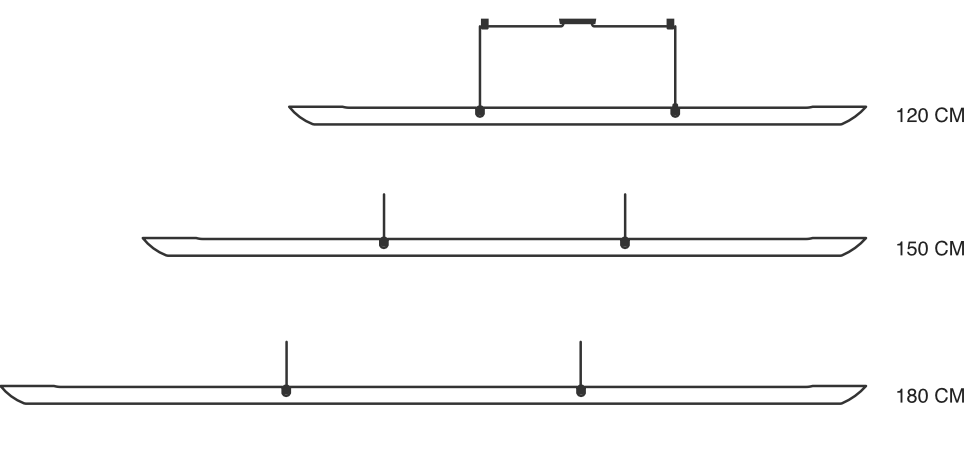 Desenhada para iluminar mesas de jantar ou de trabalho, a Lani é uma luminária linear de luz difusa e agradável. A peça é suspensa por dois cabos finos que terminam no par de penduradores em forma de estribo. No refletor há um par de recortes que expõem esses penduradores e sugerem sua continuidade na parte de baixo da peça. Um detalhe importante para a percepção do refletor estar apenas encaixado sobre a peça.