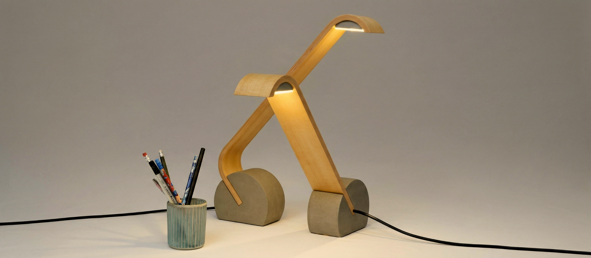 Em dois modelos, um mais baixinho e outro um pouco mais alto, plyc1 e plyc2 são luminárias geométricas de madeira e concreto.
